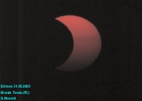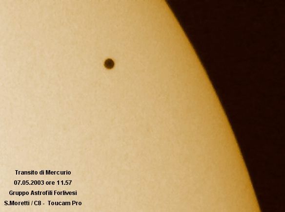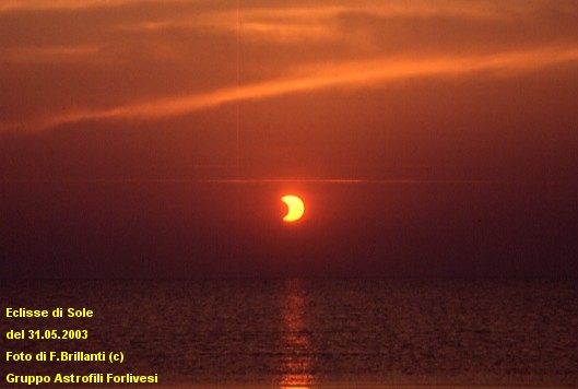 Nel corso dell'estate 2003 si e' svolto un evento astronomico molto interessante: la grande Opposizione di Marte. Ogni due anni circa, Marte e la Terra si vengono a trovare alla minima distanza reciproca, e nel caso di quest'anno, č stata la piu' "stretta" degli ultimi secoli. Il 28 Agosto 2003, il pianeta rosso si e' trovato a meno di 59 milioni di Km dalla Terra, di magnitudine -3 circa e ha sotteso un diametro angolare di 25 secondi d'arco. Tuttavia, per le nostre latitudini, la sua osservazione e' stata comunque difficoltosa , a causa della bassa declinazione (- 15°). Il GAF ha organizzato delle serate aperte a tutti di osservazione del pianeta rosso, serate che svolgono direttamente dalla Circoscrizione a partire dalle ore 21.00 circa. Le immagini a corredo di questo articolo sono state ottenute da soci GAF. Non perdetela d'occhio e leggete questo articolo Osservazione Eclisse di Sole del 31.05.2003 In occasione di questo interessante evento astronomico, il Gruppo Astrofili Forlivesi ha organizzato l'osservazione da due siti distinti: il primo sulla spiaggia di Cervia (RA) ed il secondo sulle colline sovrastanti Forli (Monte Testa). Oltre che per motivi opportunistici, questa scelta era motivata dall'avere a disposizione due situazioni orografiche opposte, al fine di minimizzare l'influenza di eventuali condizioni atmosferiche disturbanti. A conti fatti, l'osservazione marittima, ha dato i risultati migliori, avendo avuto la possibilita' di osservare il disco solare eclissato, fin dal suo srgere dal mare, condizione questa che purtroppo non e' stata verificata dalla collina, con banchi di foschie che oscuravano il sorgere del sole. In generale quindi il tutto si e' svolto nel migliore dei modi; l'unico fatto inatteso e' stato proprio la spettacolarita' del fenomeno stesso! Ebbene si' avete capito bene: nemmeno noi astrofili ci aspettavamo un evento cosė spettacolare. I presupposti erano poco promettenti, con il Sole eclissato al sorgere, e la fine del fenomeno con il nostro astro diurno alto solamente 4 gradi sopra l'orizzonte. Invece, e per fortuna, la natura ci ha regalato un evento memorabile, con colori ed immagini che superavano largamente le nostre attese. Le immagini riprodotte sono state ottenute dai soci Eolo Serafini e Franco Brillanti e Stefano Moretti; le immagini di E.Serafini si possono trovare su alcuni dei piu' importanti siti internet che riportano la documentazione dell'eclisse (http://spaceweather.com/eclipses/gallery_31may03_page2.html; http://www.xs4all.nl/~carlkop/zoneclips/eclipse.html; ecc.). Il transito di Mercurio sul disco del Sole osservato dal Gruppo Astrofili Forlivesi di Stefano Moretti Il transito di Mercurio sulla