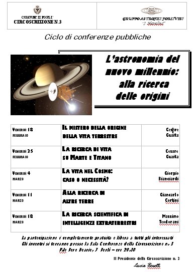 Il 18 febbraio ha preso il via il ciclo di conferenze pubbliche con tema la vita sulla Terra e nell'Universo. Sono intervenuti esperti multidisciplinari che hanno affrontato esaustivamente i temi legati alla ricerca della vita nel Cosmo. Una folta partecipazione di pubblico ha fatto da cornice a questo importante evento divulgativo patrocinato dalla Circoscrizione n.3. (scarica il volantino)
