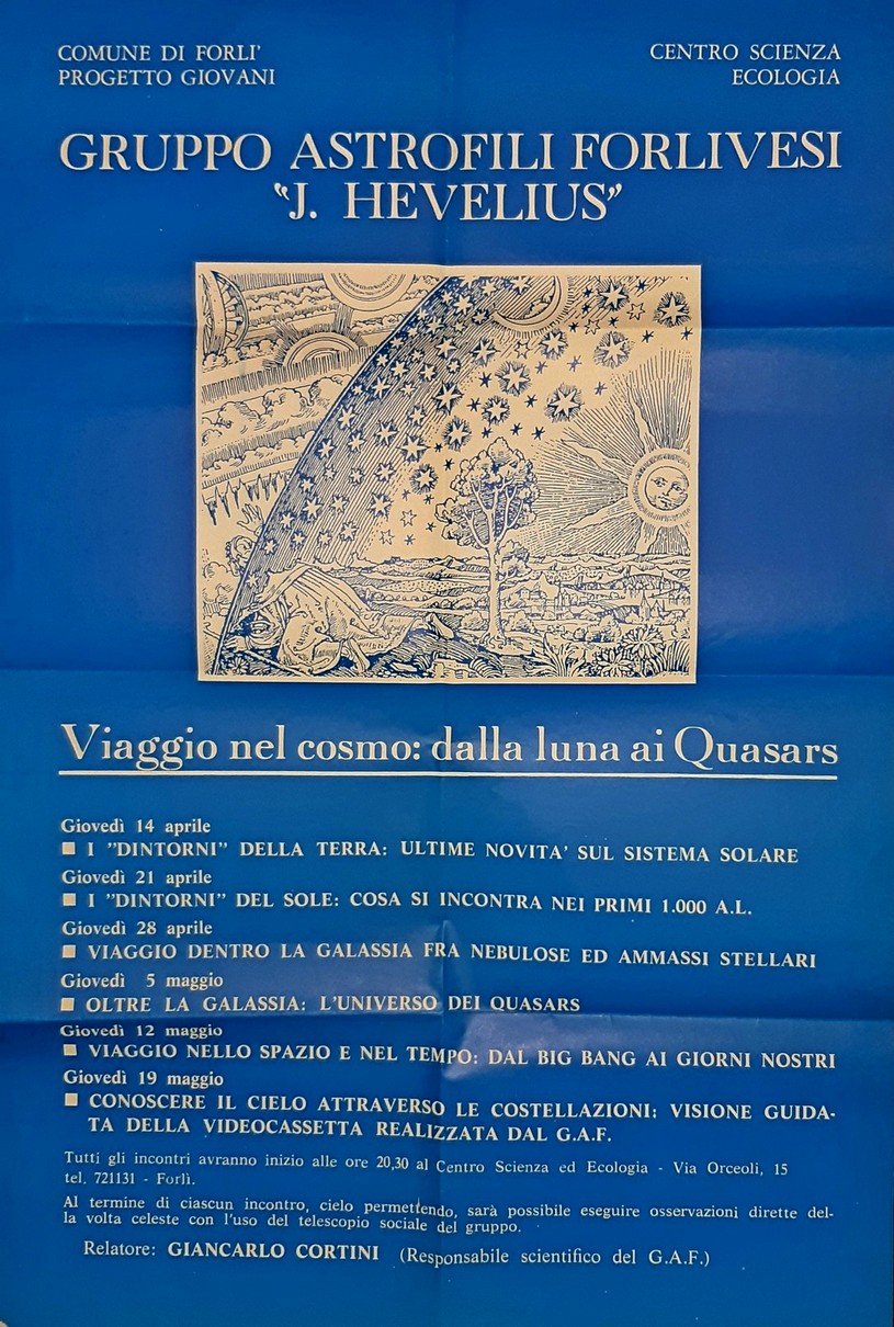 VIAGGIO NEL COSMO: DALLA LUNA AI QUASARS (Centro scienza ecologia Comune di Forlì) 14.04.1988 Giancarlo Cortini I “dintorni” della Terra: ultime novità sul Sistema Solare 21.04.1988 Giancarlo Cortini I “dintorni” del Sole: cosa si incontra nei primi 1000 anni luce 28.04.1988 Giancarlo Cortini Viaggio dentro la Galassia fra nebulose ed ammassi stellari 05.05.1988 Giancarlo Cortini Oltre la Galassia: l’universo dei quasars 12.05.1988 Giancarlo Cortini Viaggio nello spazio e nel tempo: dal Big Bang ai giorni nostri