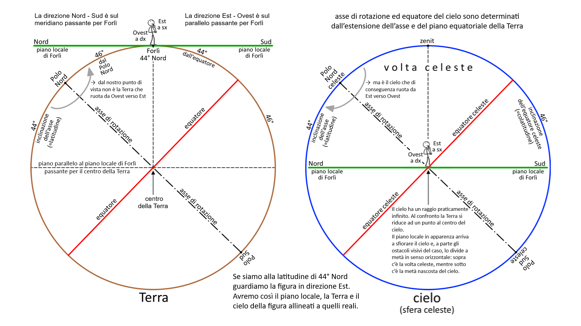 A sinistra c’è l’osservatore di Forlì. A destra per portarci alla latitudine Sud di -44° dobbiamo portare il Polo Sud celeste 44° sopra il piano locale dalla parte Sud.